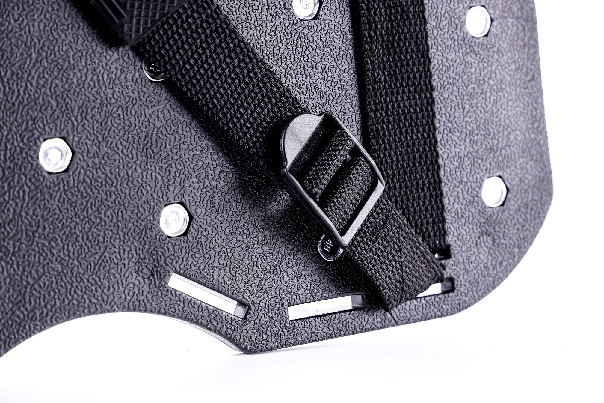 Nakładki są szerokie i maja uniwersalny rozmiar. Montaż na butach roboczych odbywa się za pomocą regulowanych szerokich pasków zaciskowych. Paski są długie i mocne dzięki czemu nakładka dobrze trzyma się nawet na dużym bucie. Dodatkową stabilizację zapewnia zapiętek, który blokuje but i nie pozwala mu na wyślizgnęcie z podeszwy.