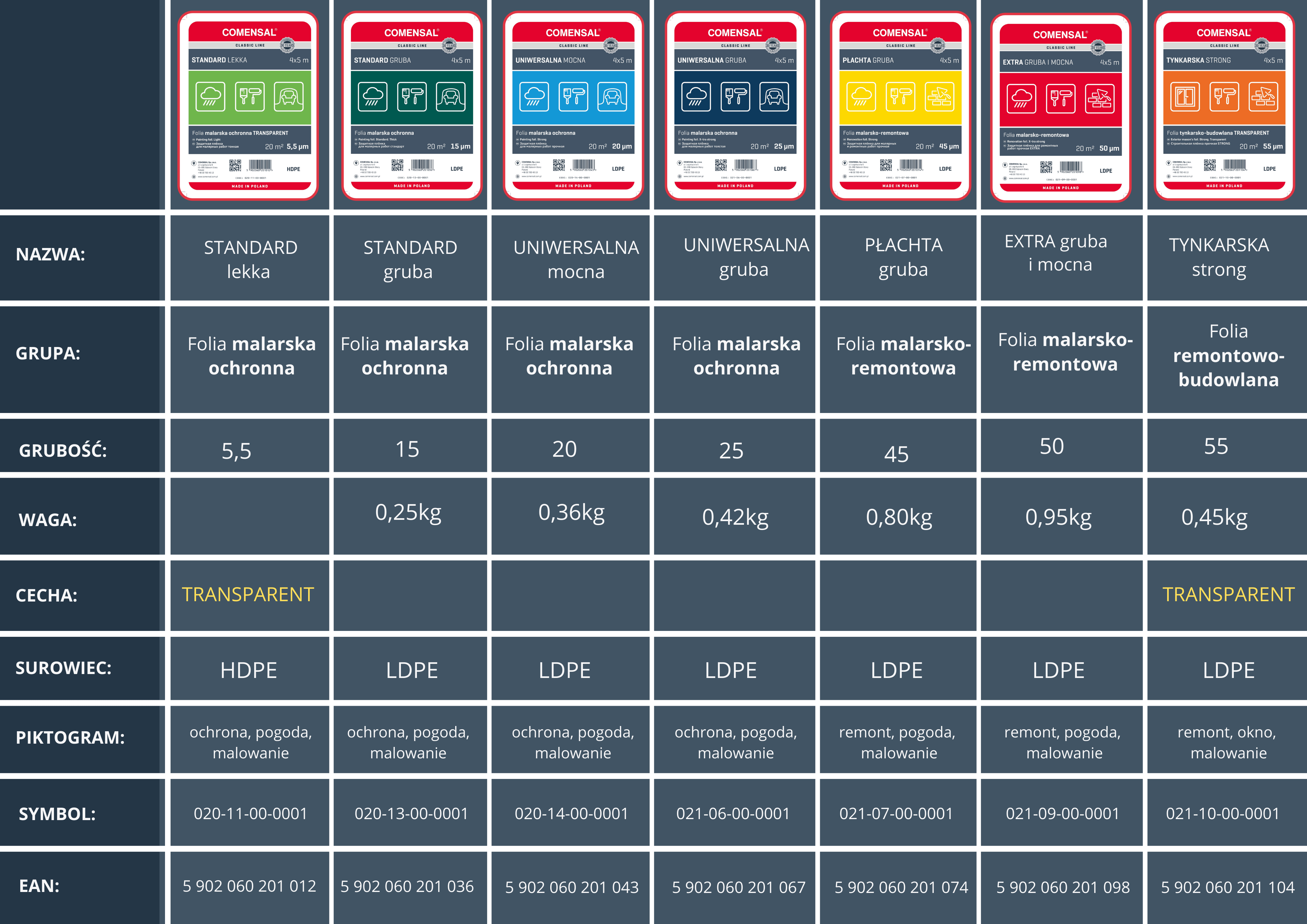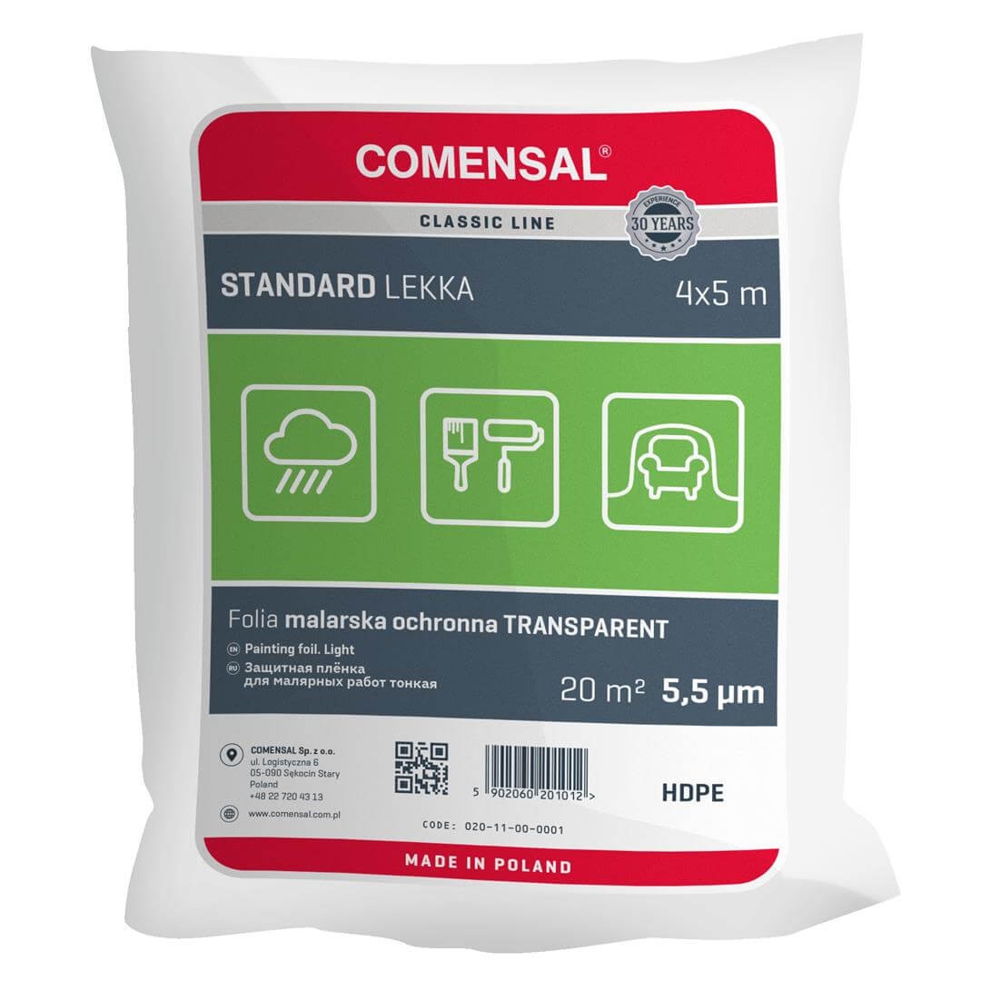 Folia malarska STANDARD 5,5my jest najcieńszą folią spośród 7 dostępnych w portfolio marki COMENSAL. Jest cienka i lekka, dzięki czemu łatwo układa się na chronionym przedmiocie, a dzięki naturalnemu naelektryzowaniu przylega do niego.