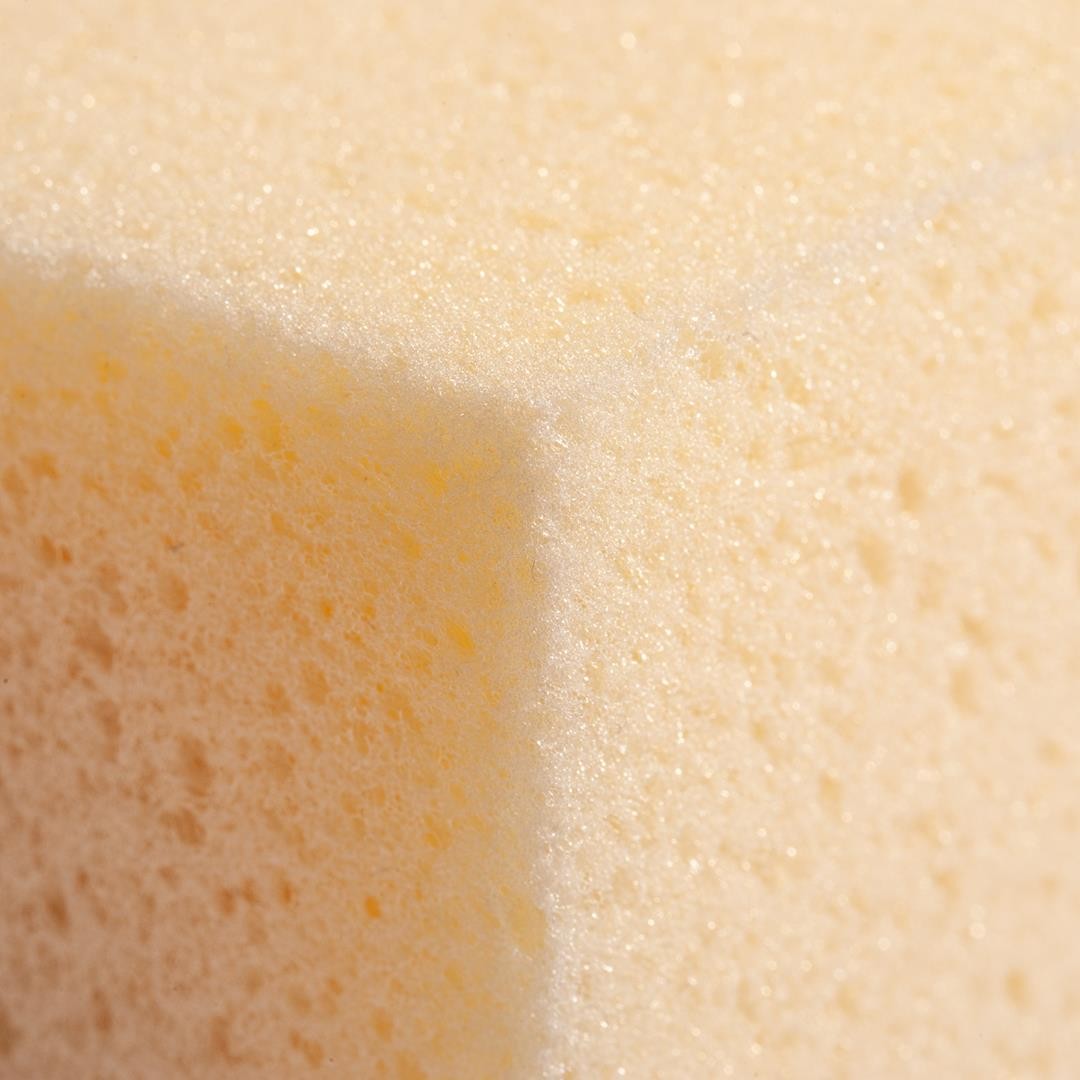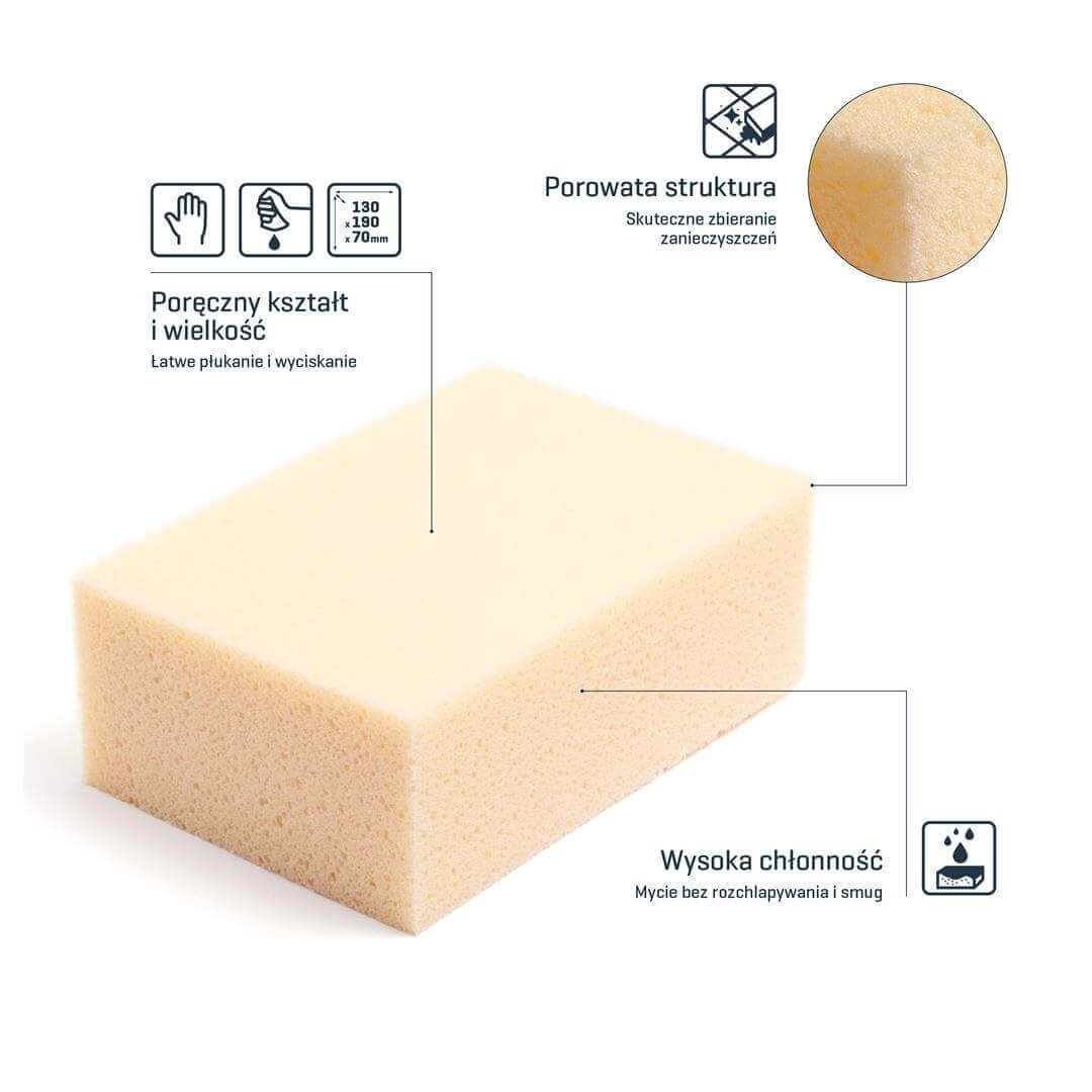 - Gąbka została wykonana z wysokiej jakości surowca. Należy do grupy gąbek poliuretanowych. Jest sprężysta i porowata. Łatwo się ją płucze i wyciska. Czysta i wysuszona po pracy, będzie długo spełniać swoje funkcje.