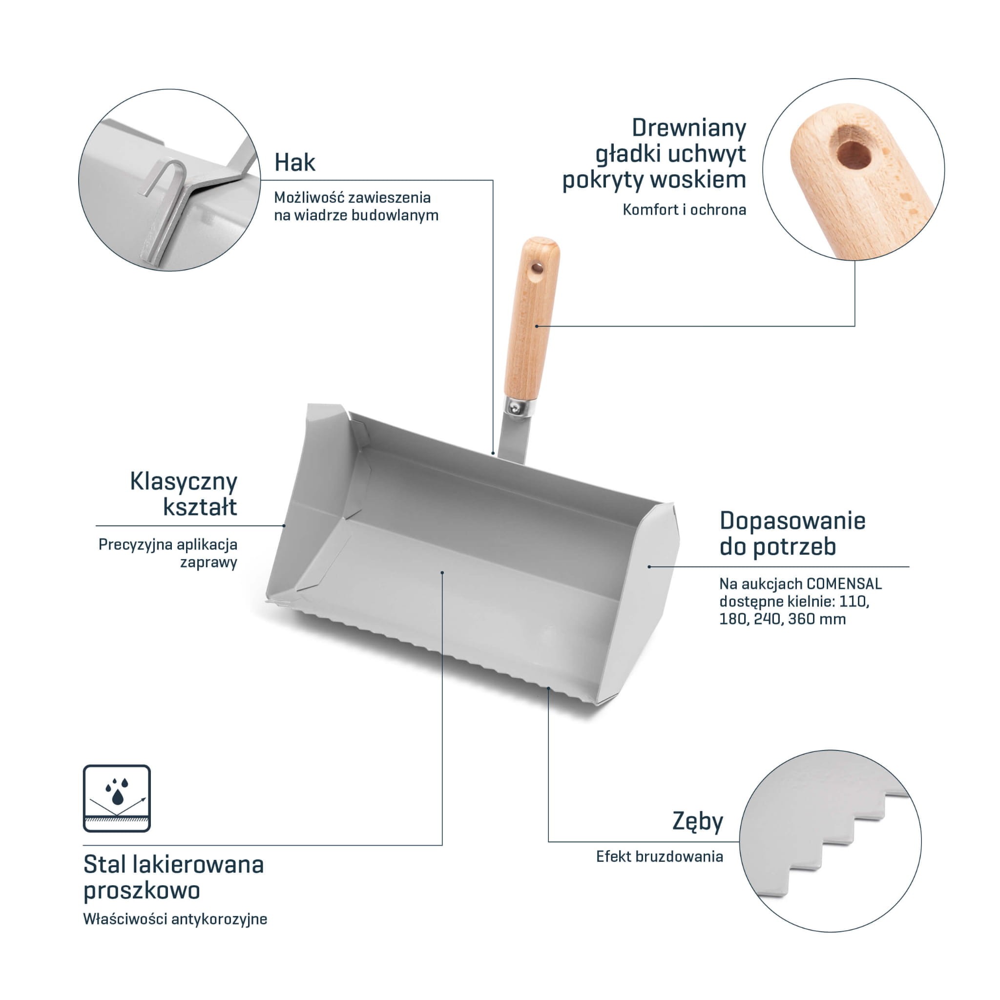 - Wymiary kielni dostępnych na aukcjach COMENSAL odpowiadają najbardziej popularnym wielkościom bloczków komórkowych. Na tej aukcji kielnia ma szerokość 360mm.