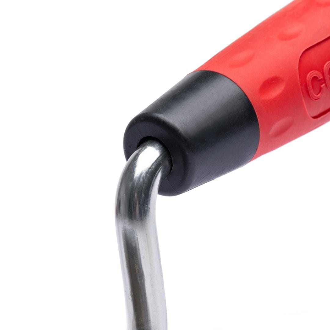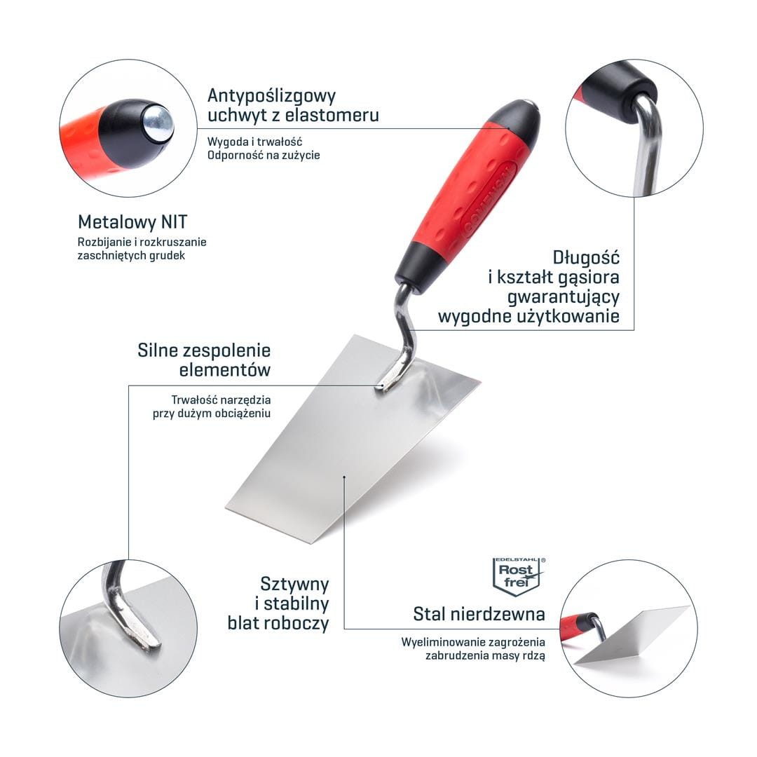 - Jego kształt został zaprojektowany pod „konkretny chwyt”, w który dłoń układa się podczas pracy kielnią.