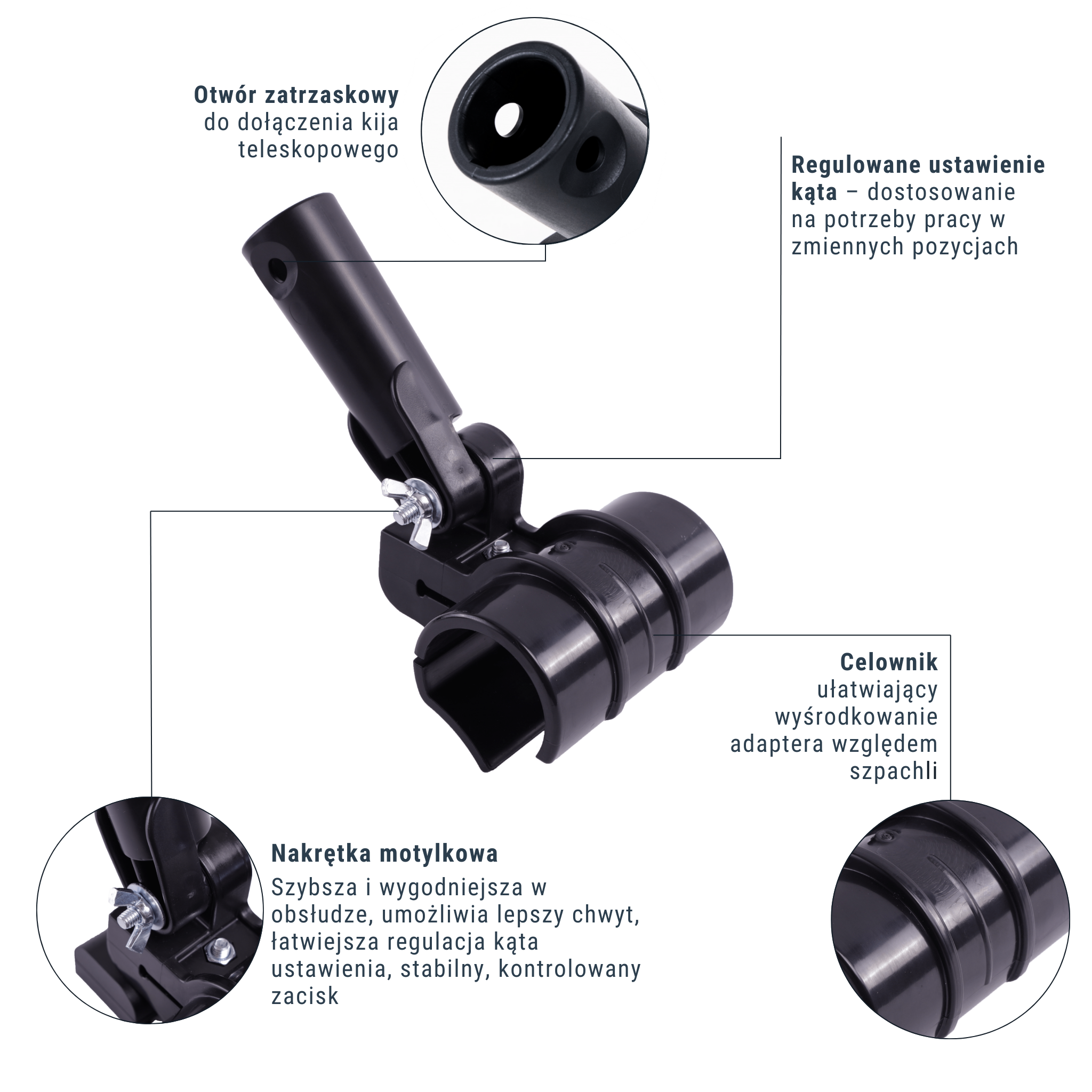 • Blokada zatrzaskowa dzięki której montaż/demontaż kija w adapterze trwa ułamek sekundy i pozostaje stabilnie w nim osadzony;