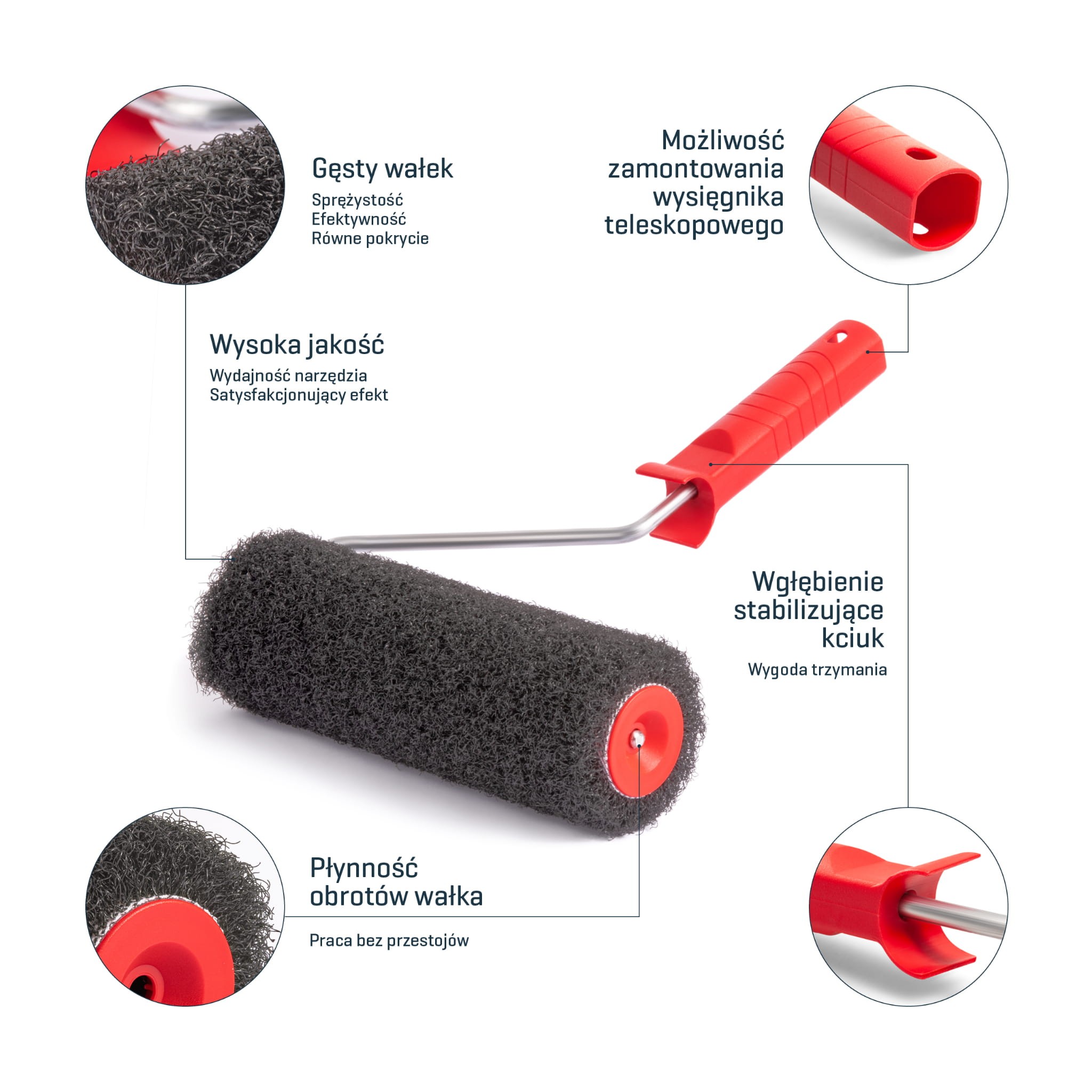 Wałek w dotyku jest „ścisły” i sprężysty. Został wykonany z wysokiej jakości gęsto upakowanych pofalowanych nylonowych „nitek”, które trwale trzymają się podkładu przyklejonego do rdzenia: