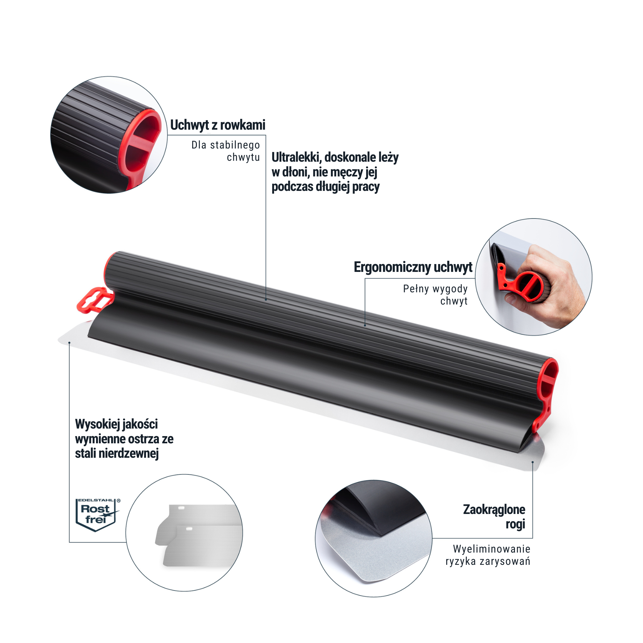 • Dodatkowe sprężyste ostrze 60cm o grubości 0,3mm = Praca z miększymi materiałami/ wykonanie cienkiej warstwy gładzi/ idealne wygładzenie powierzchni;