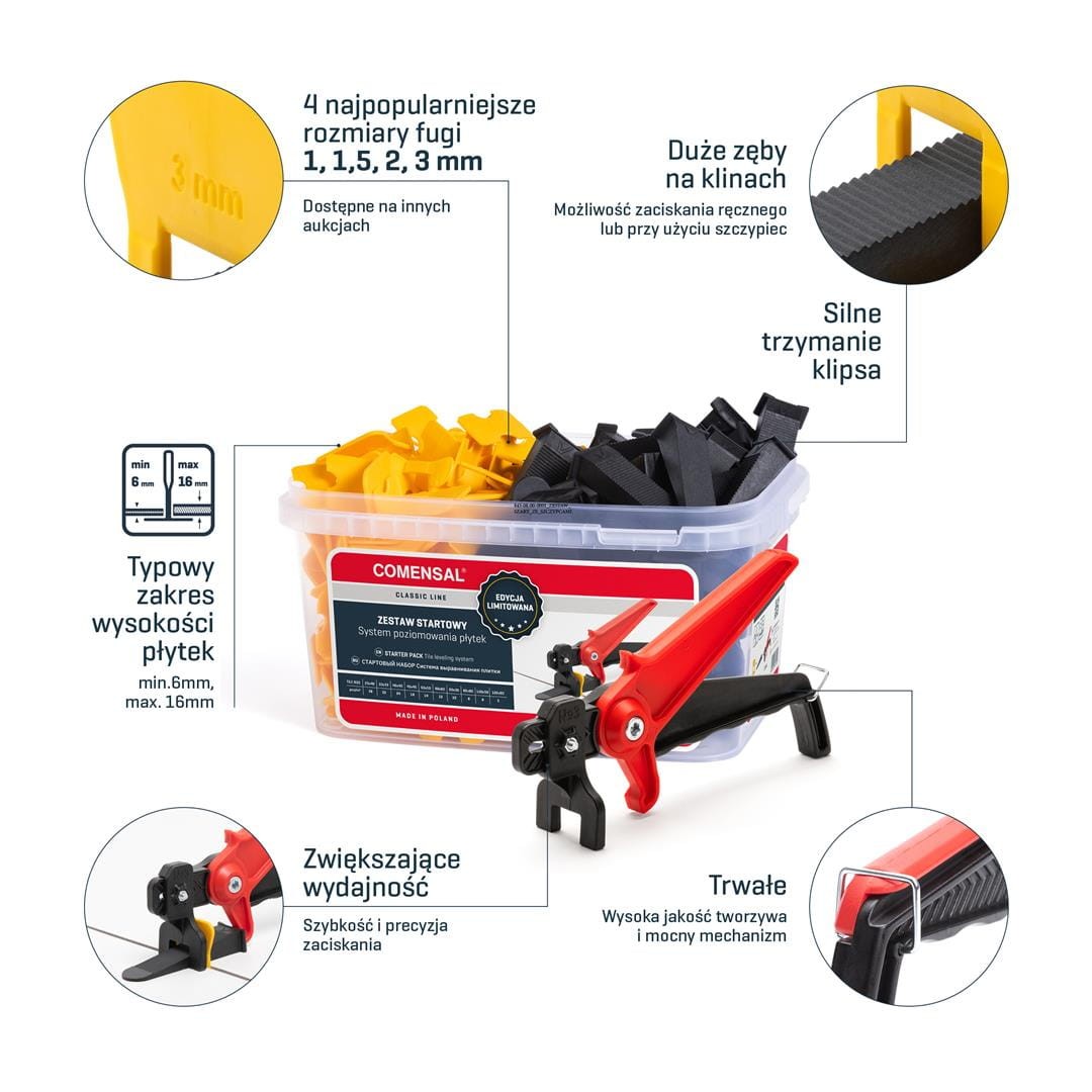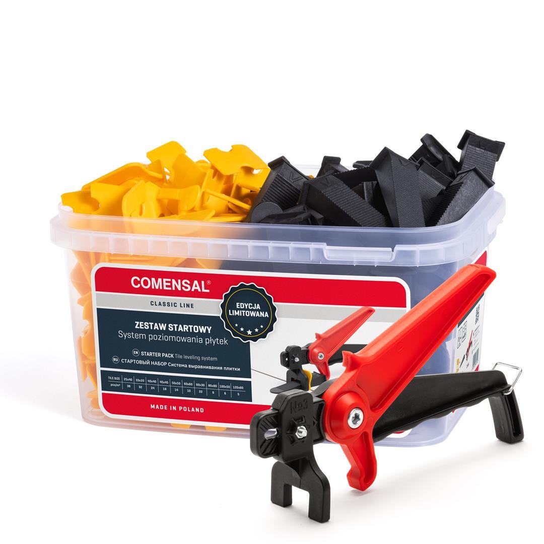 Zestaw Startowy COMENSAL zawiera wszystkie elementy, których potrzebujesz, aby rozpocząć swoją pierwszą pracę z Systemem do poziomowania płytek: