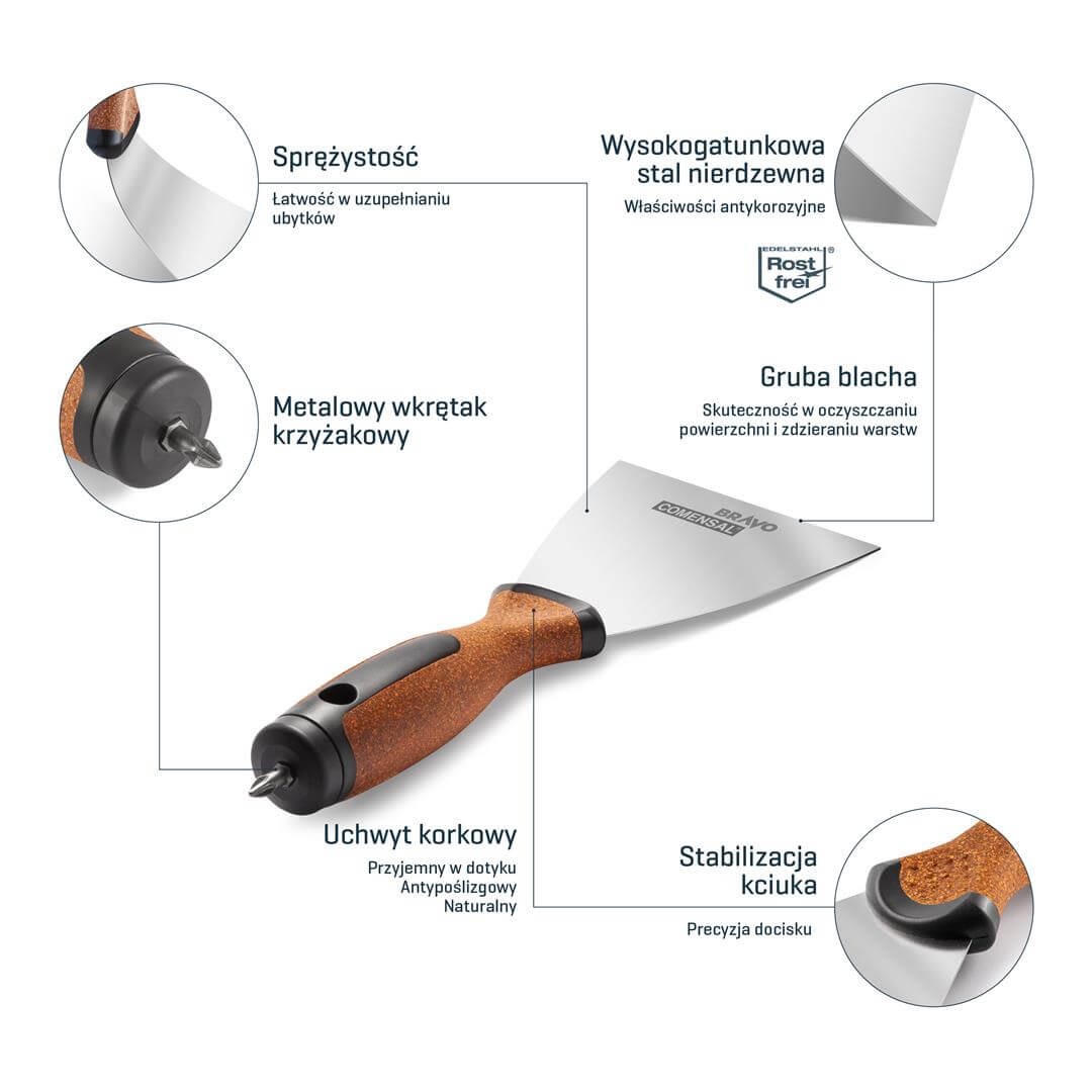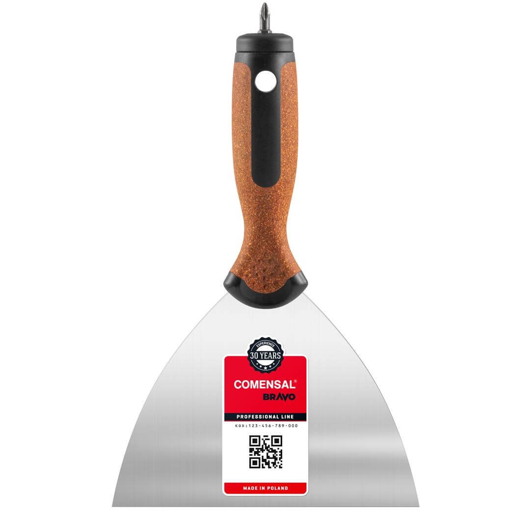 Klasyczna szpachelka ze stali nierdzewnej o szerokim ostrzu z WKRĘTAKIEM krzyżakowym z profesjonalnej linii COMENSAL BRAVO CORK – narzędzie niezbędne podczas większości małych i dużych prac remontowych, malarskich i budowlanych.
