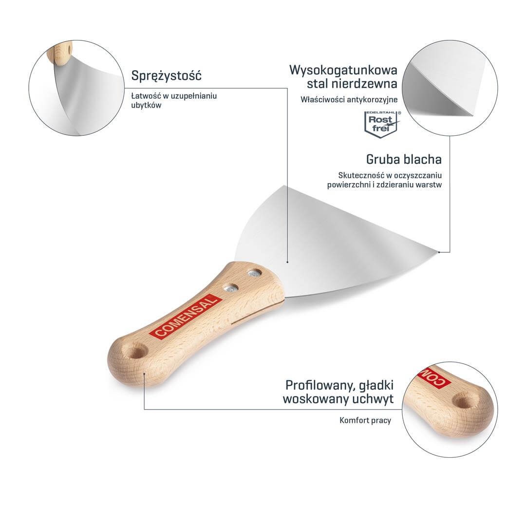 Szpachelka COMENSAL WOOD EASY 150 mm jest wykonana z wysokogatunkowej stali o dużej zawartości pierwiastków stopowych dzięki czemu jest odporna na działanie rdzy. Praca nią jest efektywna i daje poczucie kontroli nad wykonywaną czynnością. Blacha jest gruba i sprężysta, ścięta na ostro. Drewniana rączka bukowa wykończona woskiem dla wielbicieli naturalnych rozwiązań.