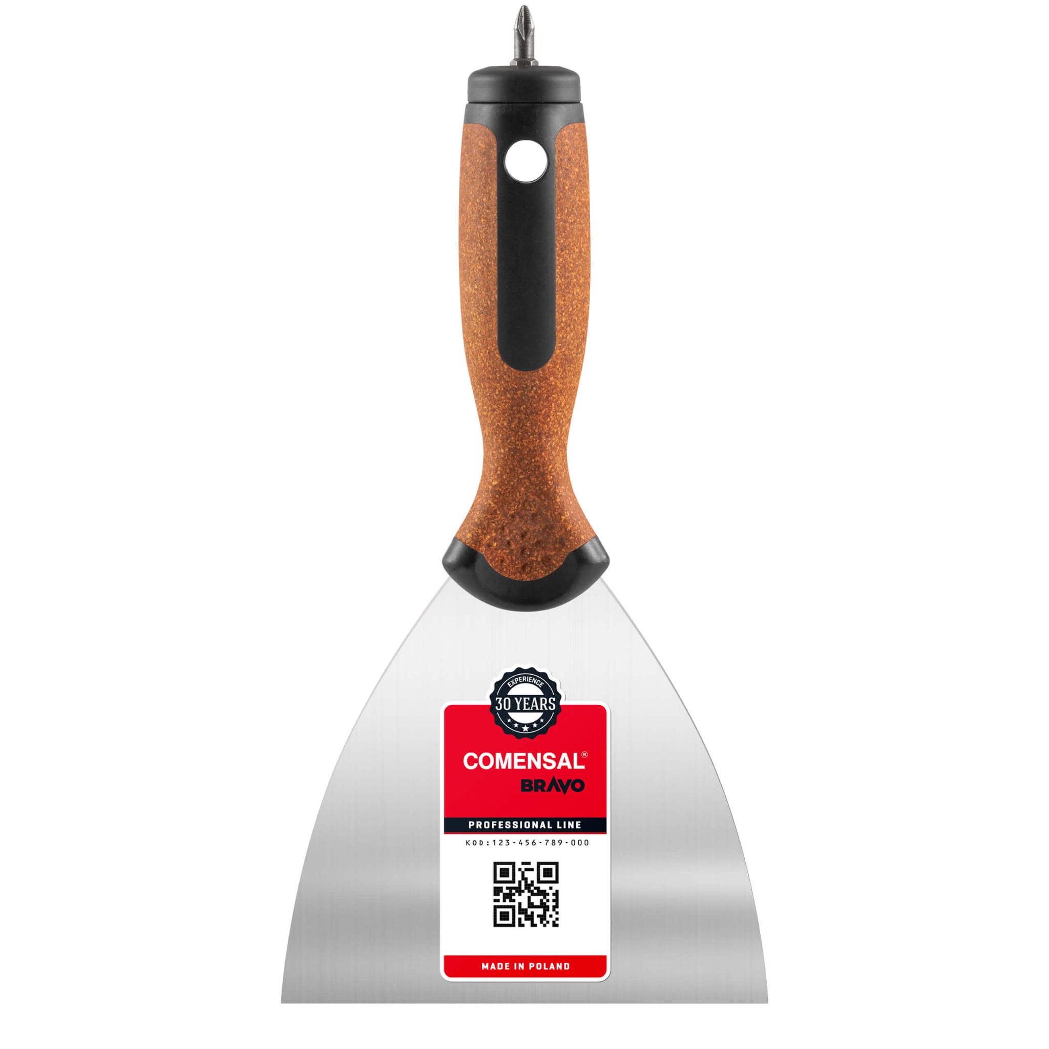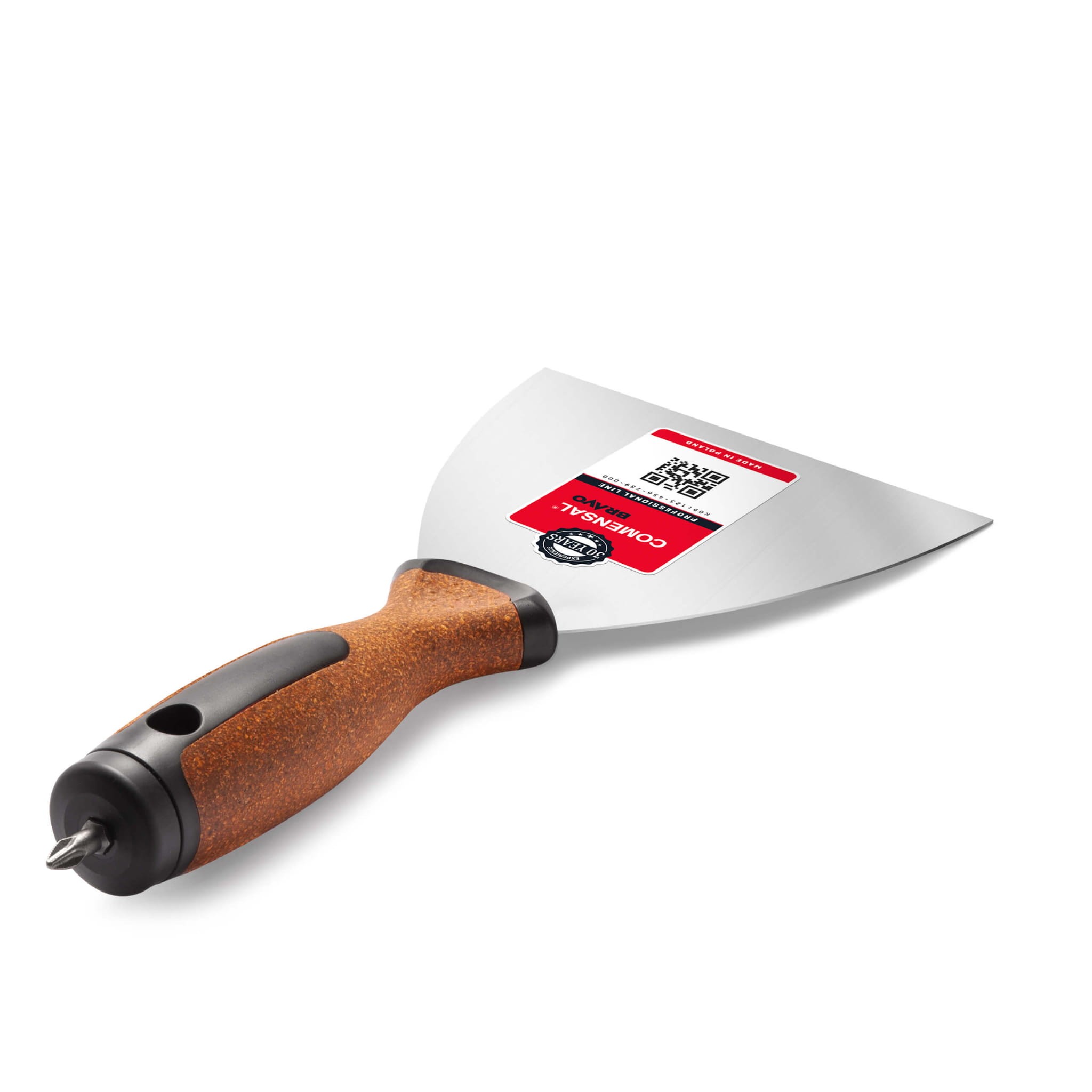 Klasyczna szpachelka ze stali nierdzewnej o szerokim ostrzu z WKRĘTAKIEM krzyżakowym z profesjonalnej linii COMENSAL BRAVO CORK – narzędzie niezbędne podczas większości małych i dużych prac remontowych, malarskich i budowlanych.