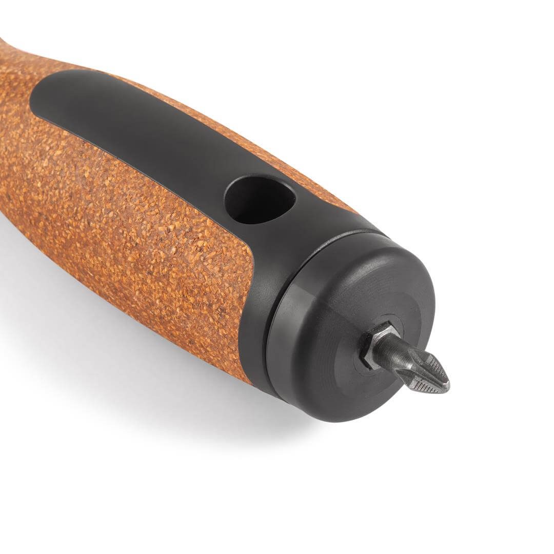 - Zewnętrzna cześć uchwytu jest wykonana z mieszaniny korka z elastomerem, co daje kombinację tworzywa odpornego na uszkodzenia, o strukturze przyjemnej w dotyku i właściwościach charakterystycznych dla naturalnego korka.