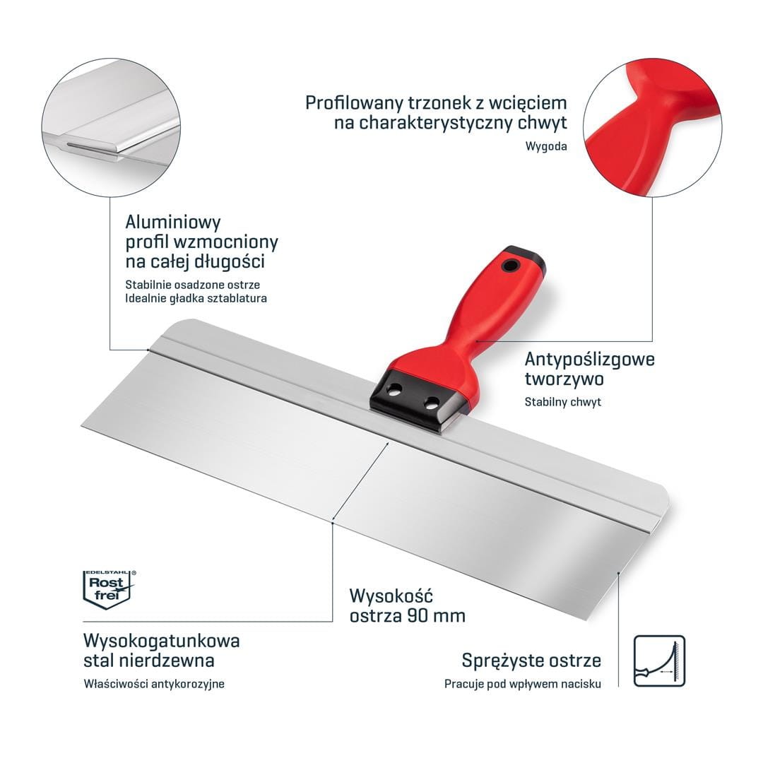 - Szerokie ostrze (90mm) zostało wykonane ze stali nierdzewnej. Jest sprężyste i umożliwia zaciągnięcie cienkiej warstwy gładzi.